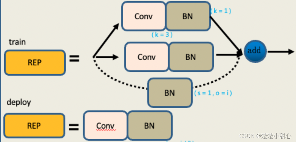最后把它们相加在一起。 - 推理模块,包含一个3x3的卷积,stride(步长为1)。是由训练模块重参数化转换而来。