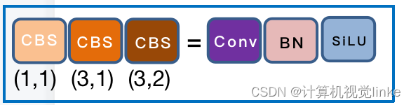 从架构图中我们可以看出,CBS模块这里有三种颜色,三种颜色代表它们的卷积核(k)和步长(s)不同。