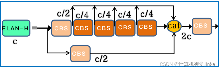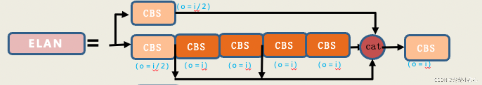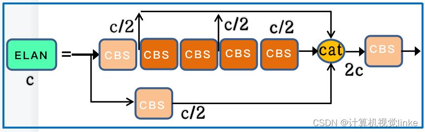 经过 4个 CBS 后,特征图变为 160 * 160 * 128 大小。随后会经过论文中提出的 ELAN 模块,ELAN 由多个 CBS 构成,其输入输出特征大小保持不变,通道数在开始的两个 CBS 会有变化, 后面的几个输入通道都是和输出通道保持一致的,经过最后一个 CBS 输出为需要的通道。