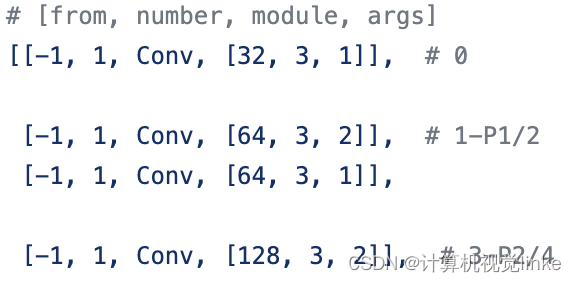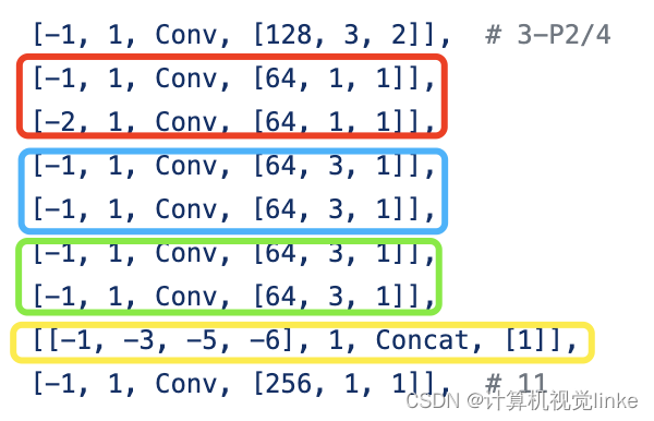 首先是经过 4 层卷积层,如下图,CBS 主要是 Conv + BN + SiLU 构成,我在图中用不同的颜色表示不同的 size 和 stride, 如 (3, 2) 表示卷积核大小为 3 ,步长为 2。 在 config 中的配置如图。