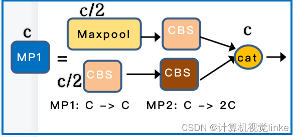 MP 层 主要是分为 Maxpool 和 CBS , 其中 MP1 和 MP2 主要是通道数的比变化。