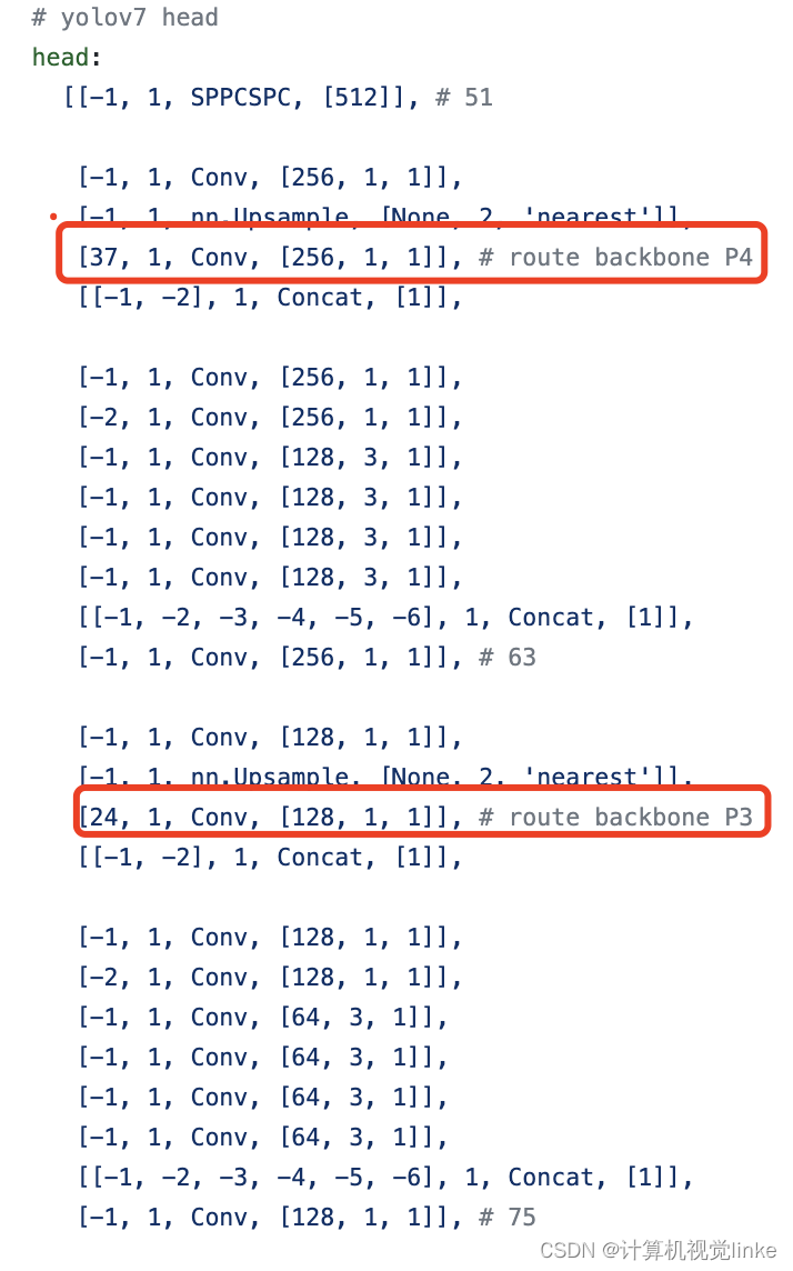 YOLOV7 head 其实就是一个 pafpn 的结构,和之前的YOLOV4,YOLOV5 一样。首先,对于 backbone 最后输出的 32 倍降采样特征图 C5,然后经过 SPPCSP,通道数从1024变为512。先按照 top down 和 C4、C3融合,得到 P3、P4 和 P5;再按 bottom-up 去和 P4、P5 做融合。