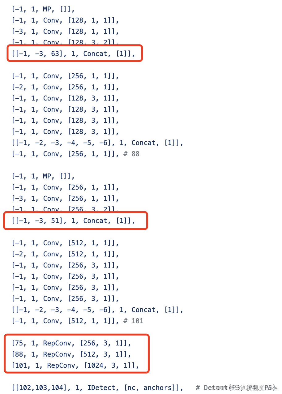 backbone的基本组件就介绍完了,我们整体来看下 backbone,经过 4 个 CBS 后,接入例如一个 ELAN ,然后后面就是三个 MP + ELAN 的输出,对应的就是 C3/C4/C5 的输出,大小分别为 80 * 80 * 512 , 40 * 40 * 1024, 20 * 20 * 1024。 每一个 MP 由 5 层, ELAN 有 8 层, 所以整个 backbone 的层数为 4 + 8 + 13 * 3 = 51 层, 从 0 开始的话,最后一层就是第 50 层。