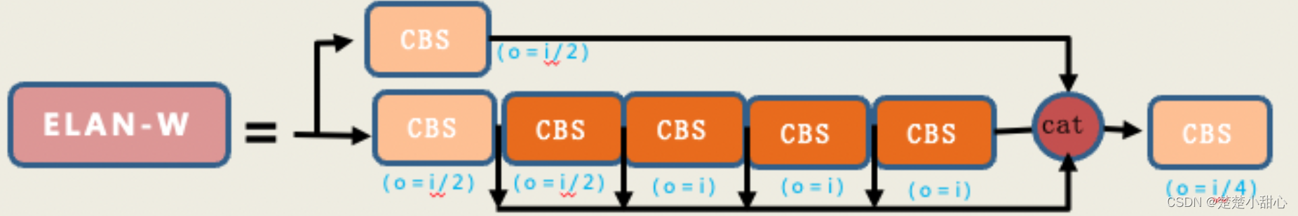 - 对于ELAN-W模块,我们也看到它跟ELAN模块是非常的相似,所略有不同的就是它在第二条分支的时候选取的输出数量不同。