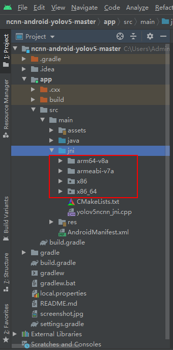 ncnn-android-yolov5项目的app/src/main/jni目录下,目录结构是这样的