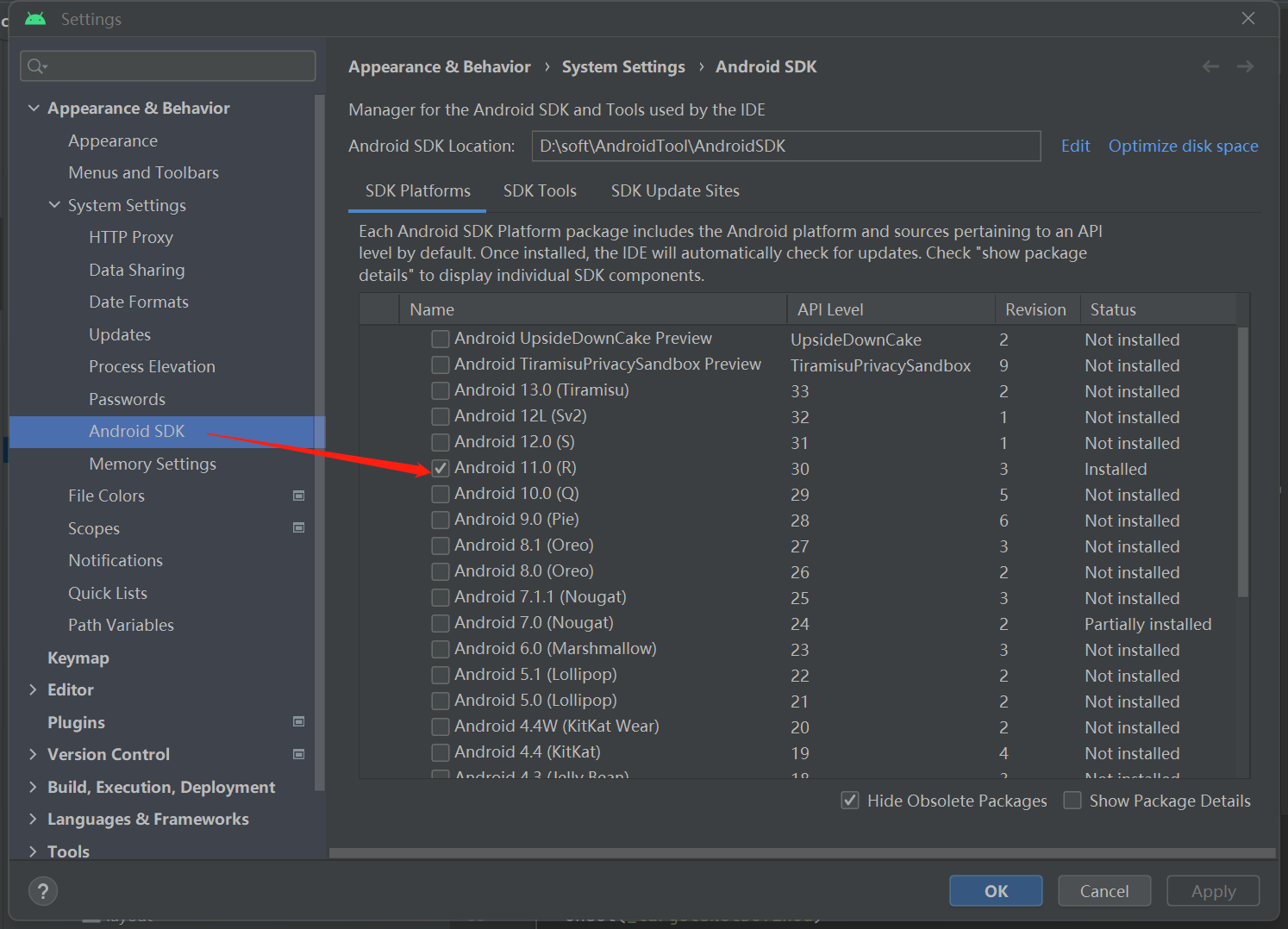 - 设置你的android的版本,选择兼容的NDK和CMake,这里我选择的NDK是21.3.6528147,CMake是3.10.2.4988404(调了一下午,才找到与gradle版本不冲突的NDK和CMake版本)